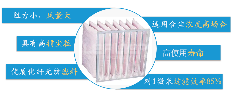 2,袋式中效過濾器濾料以極細致的特殊玻璃纖維制成,以無紡布強化,阻力低、高集塵效率