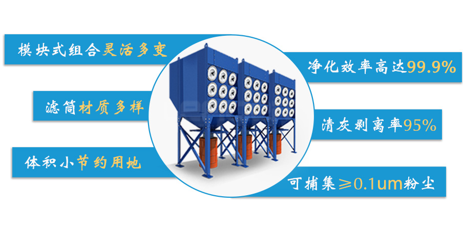 新鄉市利菲爾特濾器股份有限公司生產碳素廠粉末濾筒除塵器濾筒除塵器是以濾筒作為過濾元件所組成或采用脈沖噴吹的除塵器;主要由下列主要結構組成:模塊式框體結構、風機動力單元、脈沖反吹結構單元、濾筒過濾結構單元、粉塵收集結構單元等,其各部分元件;主要應用于煙塵量較大,對排放要求高的工況。濾筒式除塵器是一種高效節能的粉塵凈化設備。組合濾筒除塵器不但具有噴吹脈沖除塵器的清灰能力強、除塵效率高、排放濃度低等特點,還具有穩定可靠、能耗低、占地面積小的特點,特別適合處理大風量的煙氣。廣泛應用于機械加工、化工生產、粉料回收、建筑制造、醫藥生產、食品公司生產、家具生產和五金電子加工等行業的除塵。組合式濾筒除塵器是由多個獨立的室組成的,清灰時各室按順序分別進行,互不干擾,實現長期連續運行。