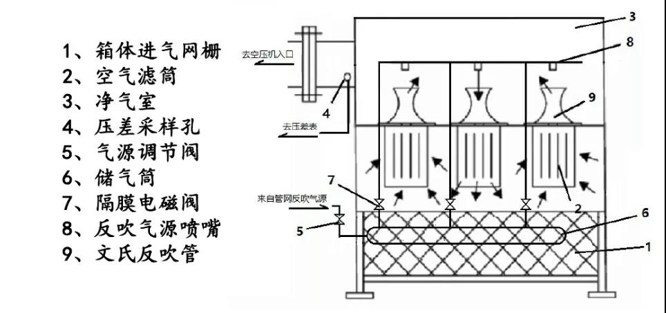 自潔過程: 含塵空氣氣經(jīng)過濾后,塵埃被吸附在高效過濾筒上,由 PLC 按設(shè)定時間順序進行反吹自潔過程, 當阻損值超過 600 帕時,由 PLC 按差壓順序控制反吹自潔過程(反吹時間為 0.1-0.2 秒)。其它高效過濾筒照常工作,塵埃被反吹自潔下來。
